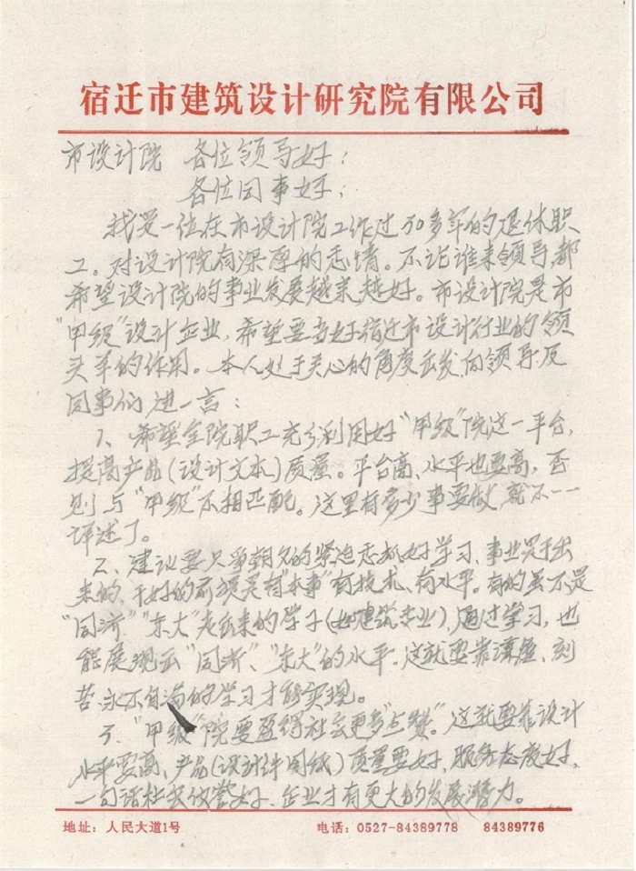 我是一位在市設(shè)計(jì)院工作過(guò)30多年的退休職工,對(duì)設(shè)計(jì)院有著深厚的感情。不論誰(shuí)來(lái)領(lǐng)導(dǎo),都希望設(shè)計(jì)院的事業(yè)發(fā)展越來(lái)越好。市設(shè)計(jì)院是是甲級(jí)設(shè)計(jì)企業(yè),希望要當(dāng)好宿遷市設(shè)計(jì)行業(yè)的領(lǐng)頭羊的作用。本人處于關(guān)心的角度出發(fā),向領(lǐng)導(dǎo)及同事們進(jìn)一言: